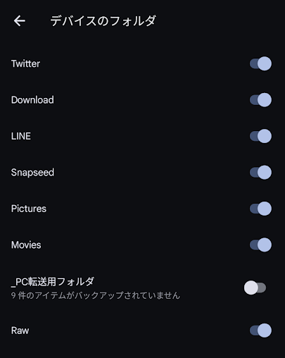 Googleフォトはフォルダ単位で「バックアップするかしないか」を選ぶことができる。